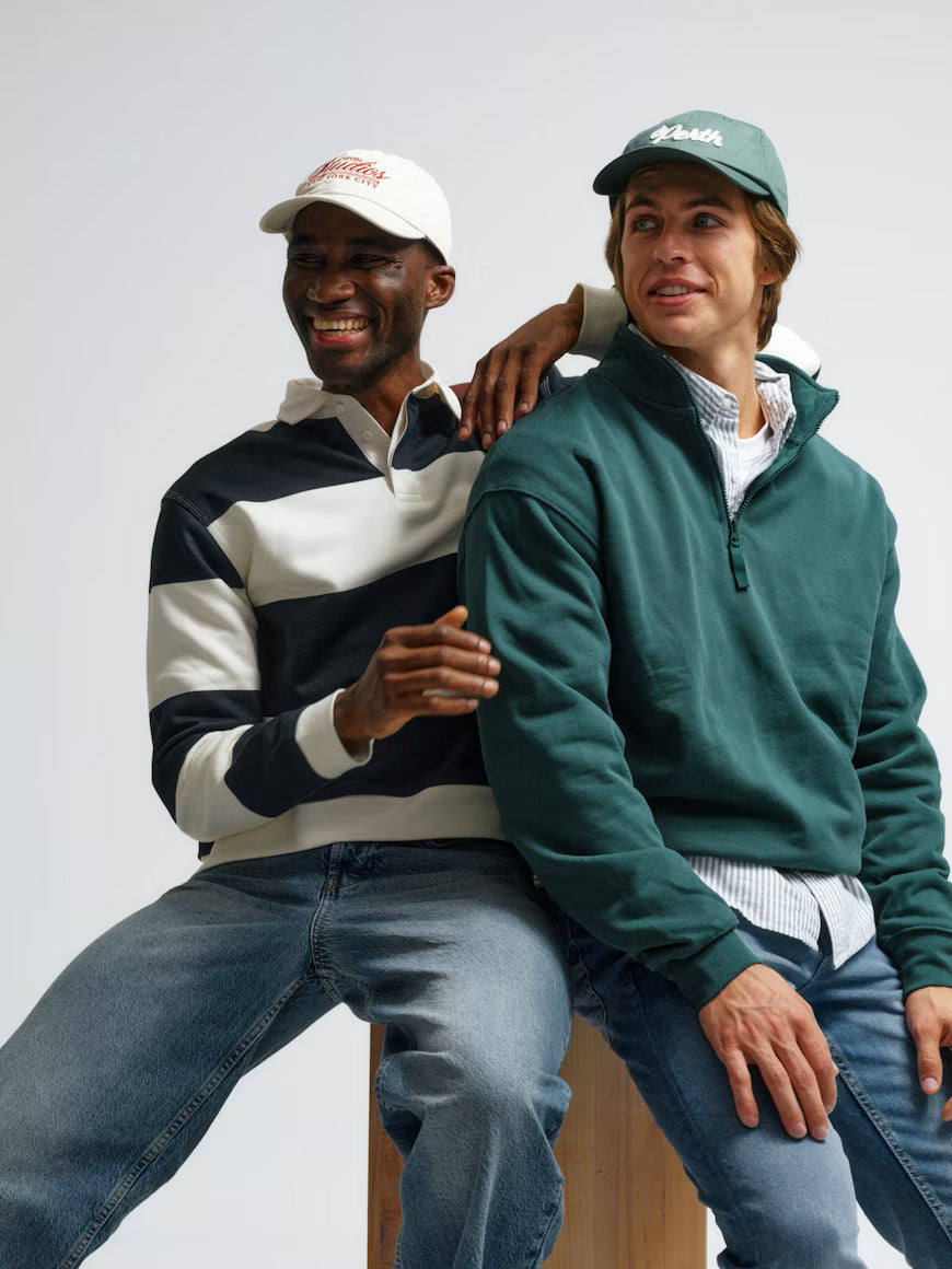 The polo neckline elevates a classic sweatshirt—looks smart with chinos.