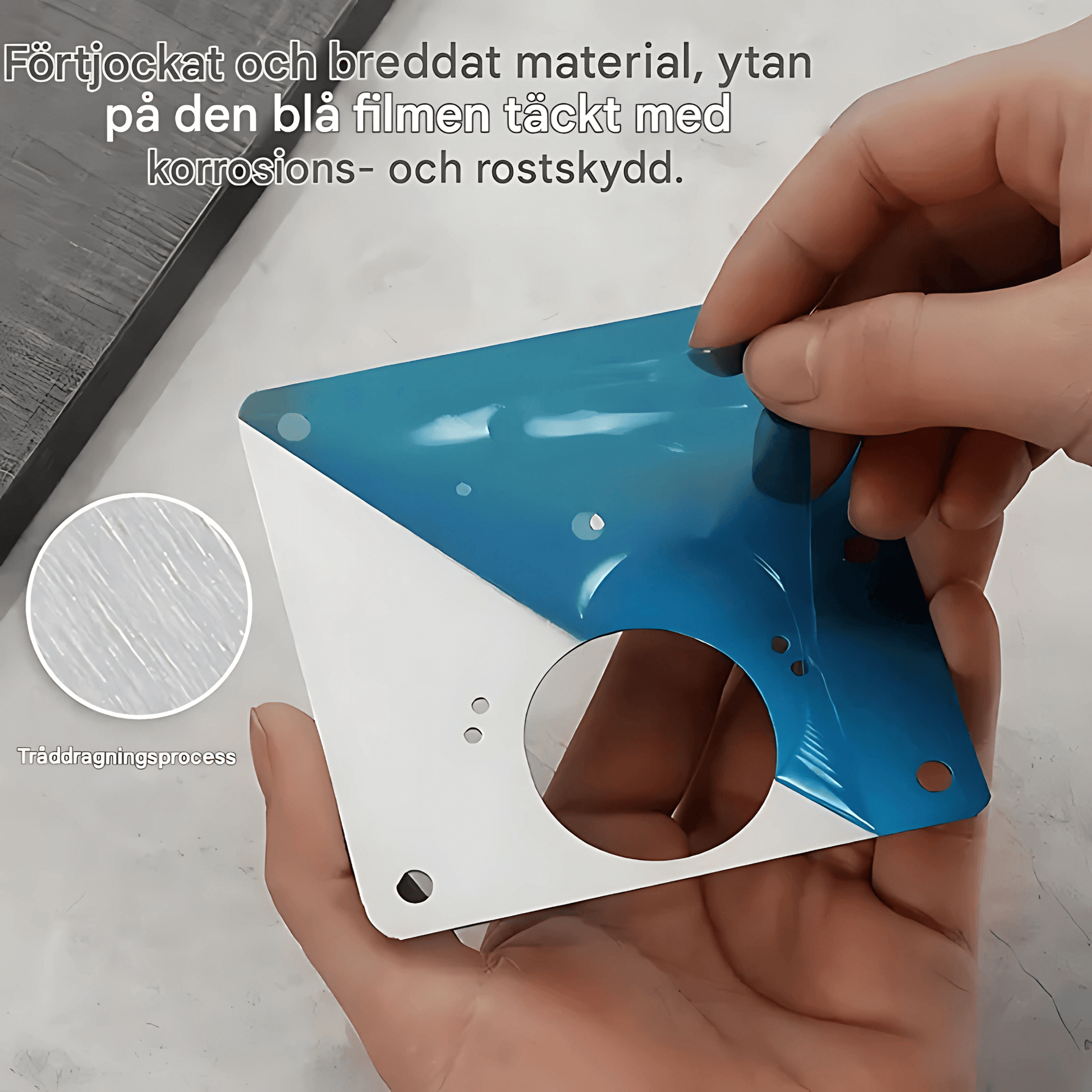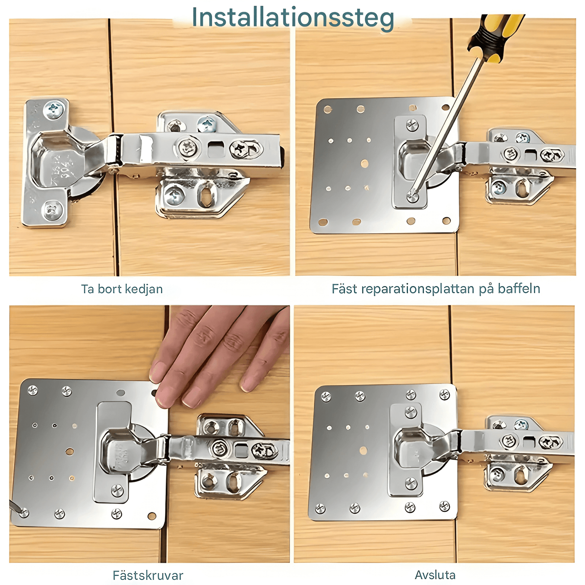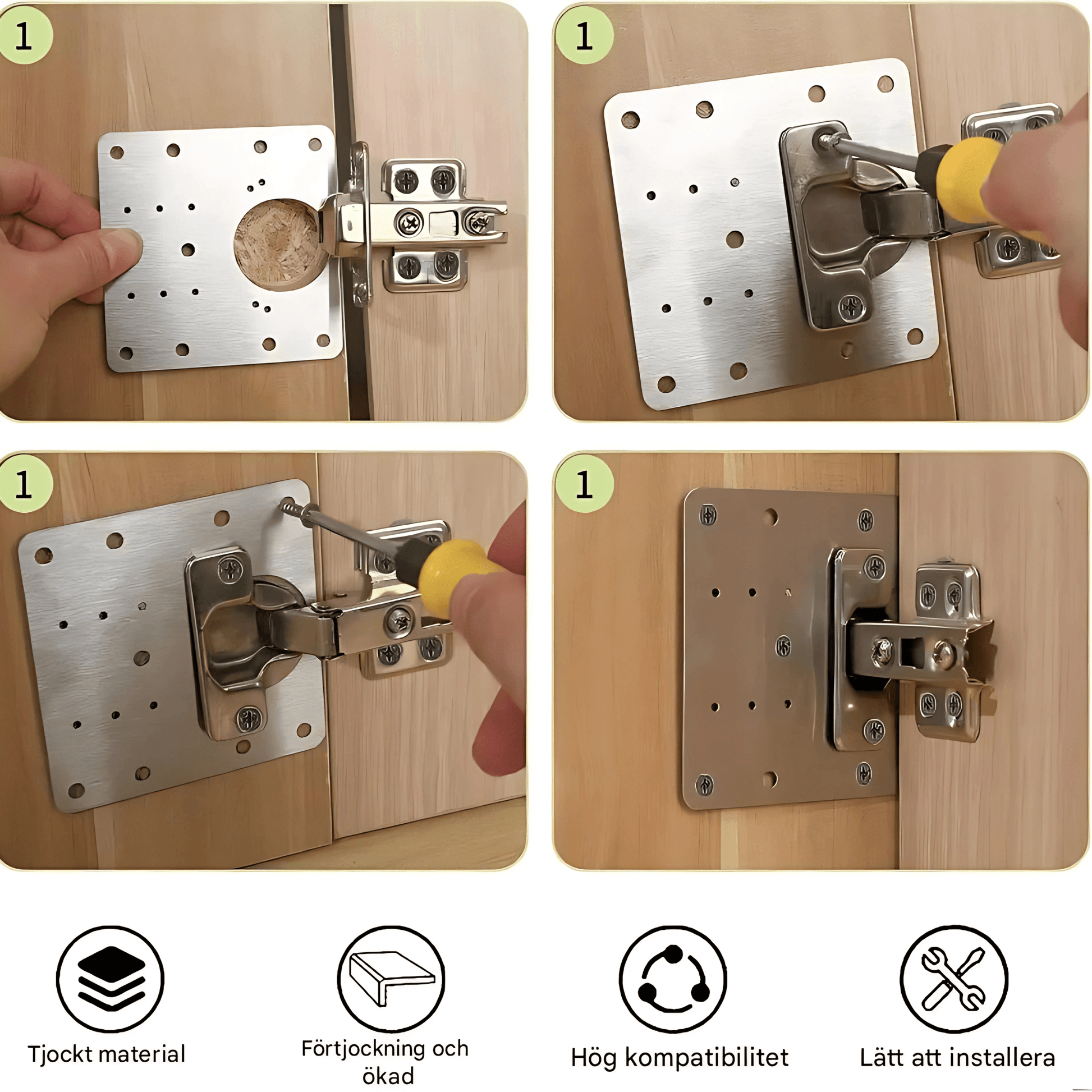 Plattorna skruvas fast med de medföljande skruvarna och kräver inga specialverktyg. På bara några minuter kan du förstärka ett gångjärn, vilket gör lösningen praktisk för både hobbyfixare och mer erfarna hemmafixare.