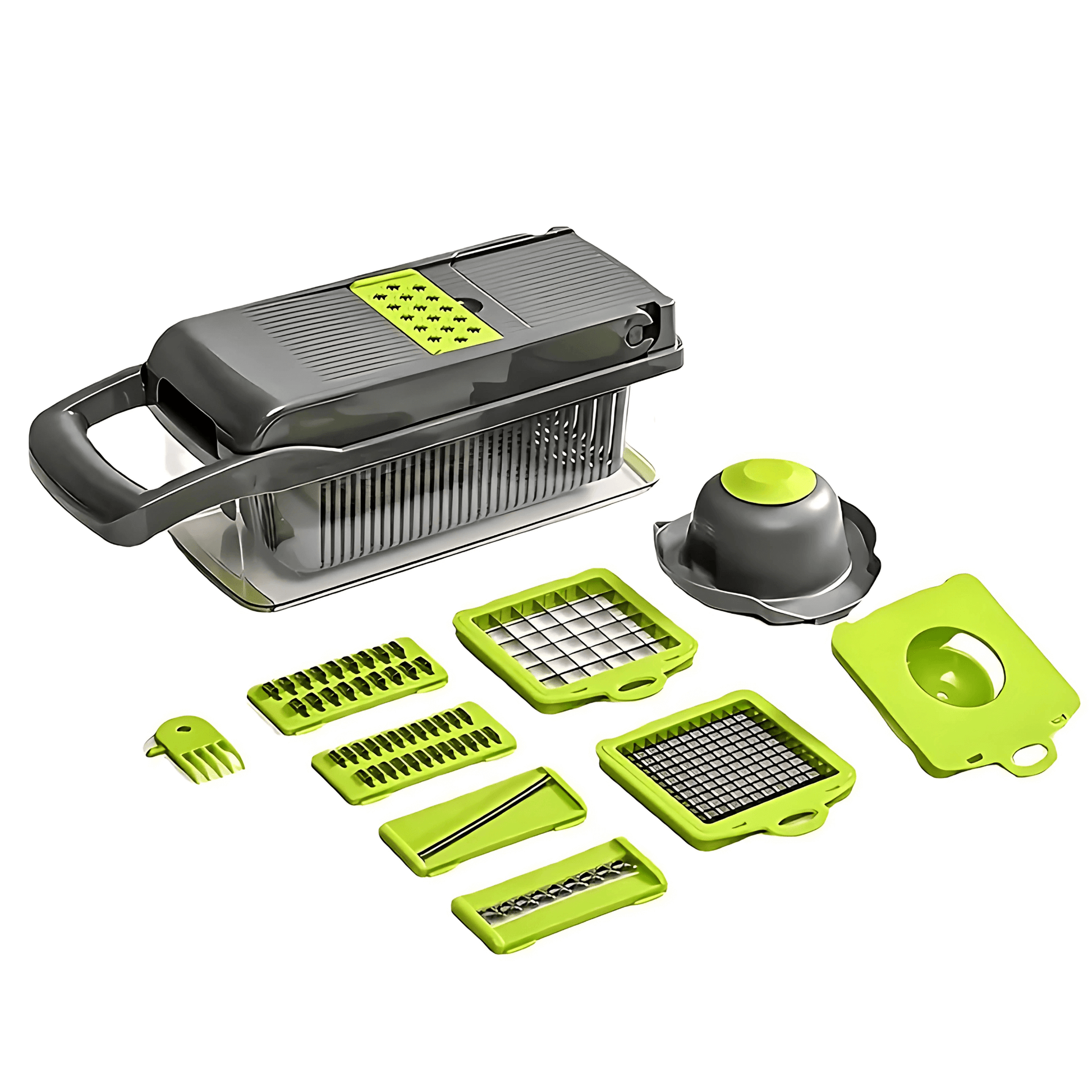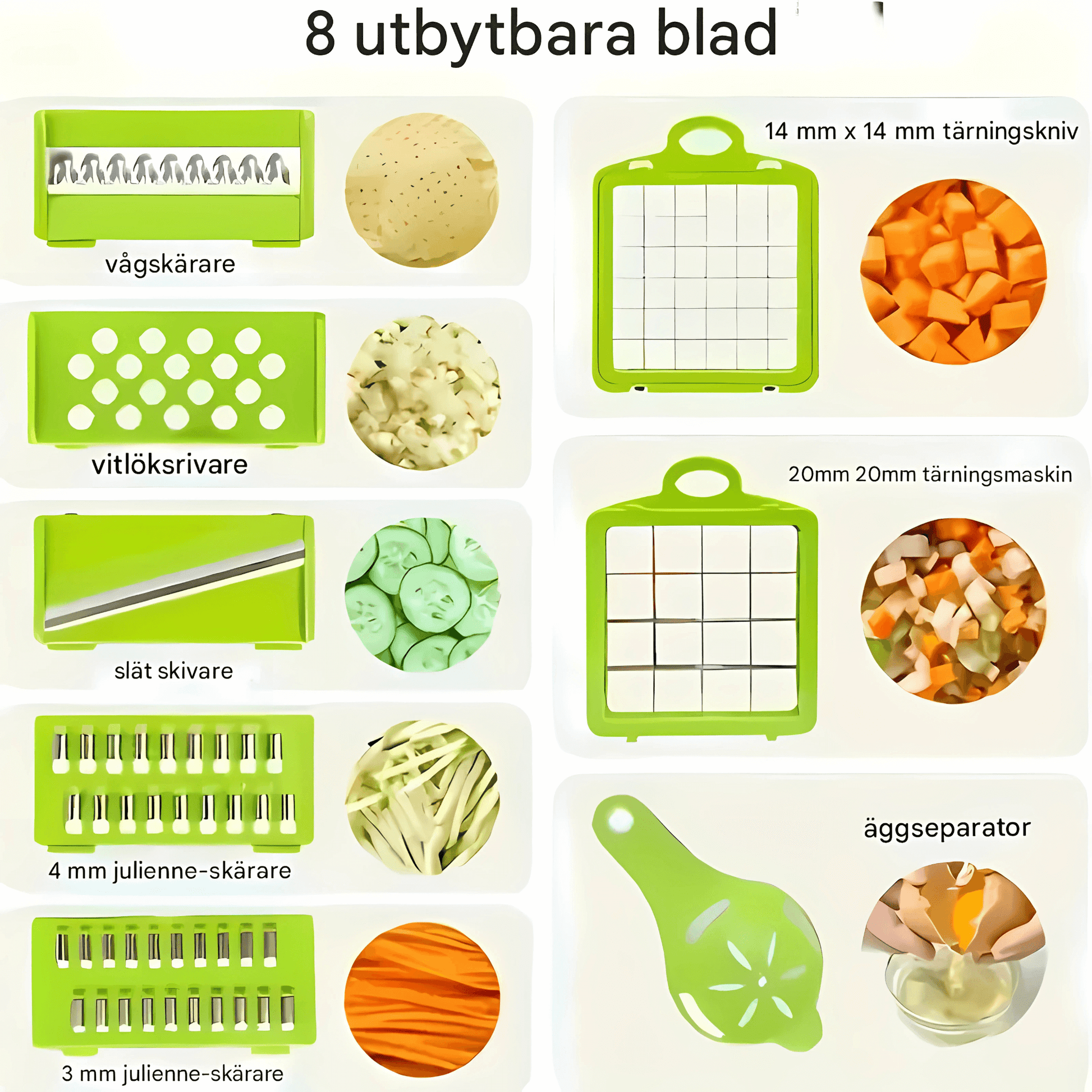 Setet innehåller allt du behöver för hackning, skivning, rivning, tärning och julienne. Varje blad och tillbehör är utformat för att göra matlagningen mer flexibel och inspirerande, oavsett om du förbereder vardagsmåltider eller experimenterar med nya recept.