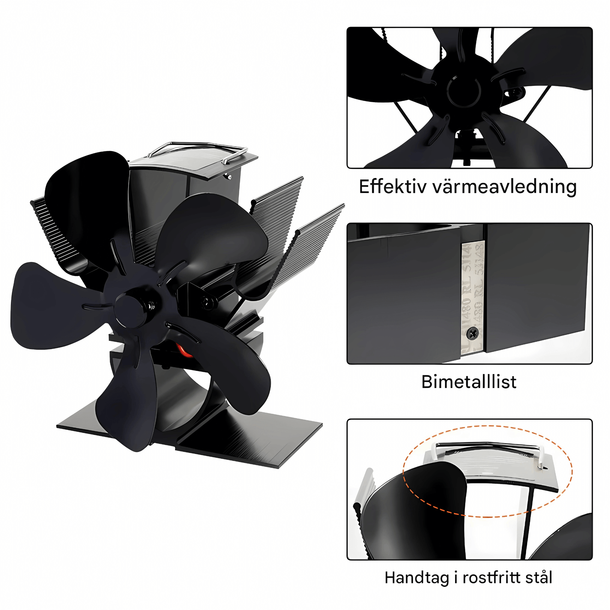 De fem bladen är utformade för att kunna sprida värmen från eldstaden effektivt i rummet, vilket kan bidra till jämnare temperaturfördelning.