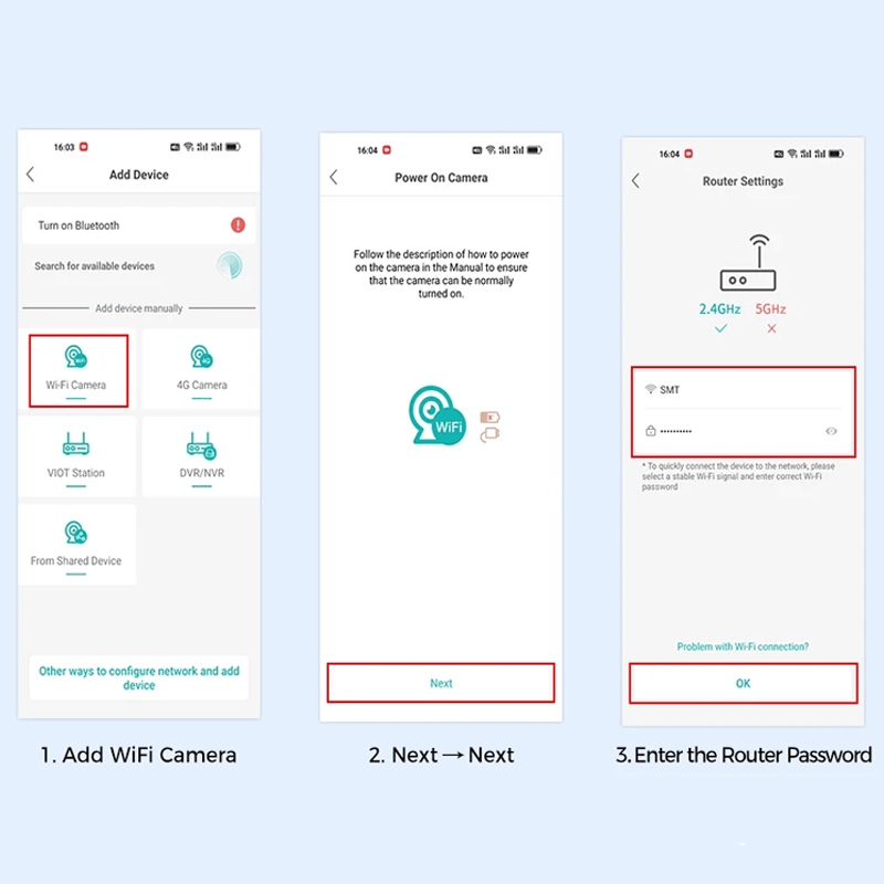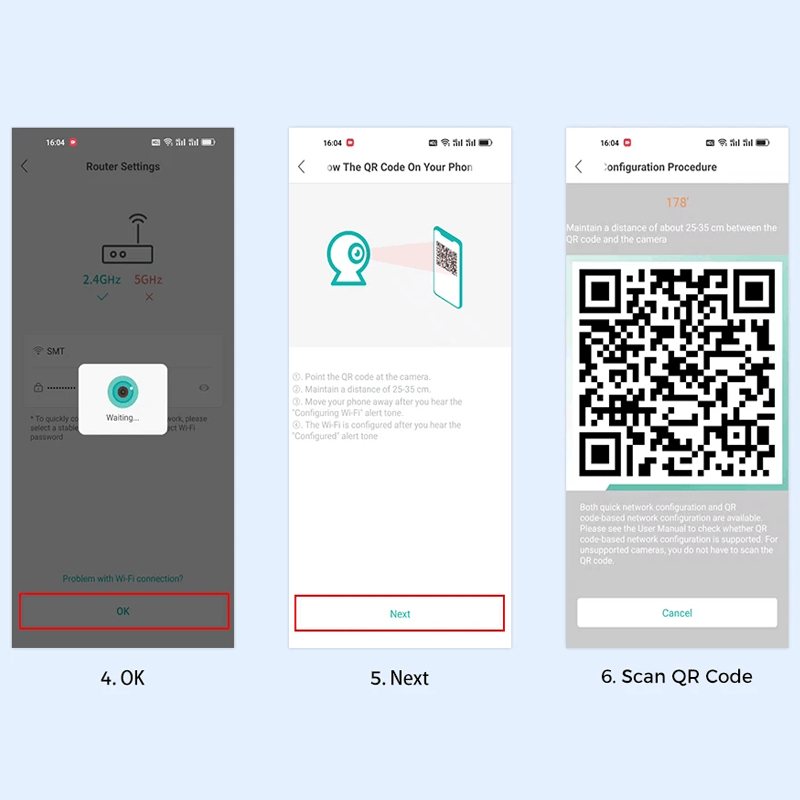 3. Anslut kameran genom det 2,4 GHz WiFi-nätverksbandet. Följ de 6 stegen på bilden för att ansluta, och du kan konfigurera den framgångsrikt.