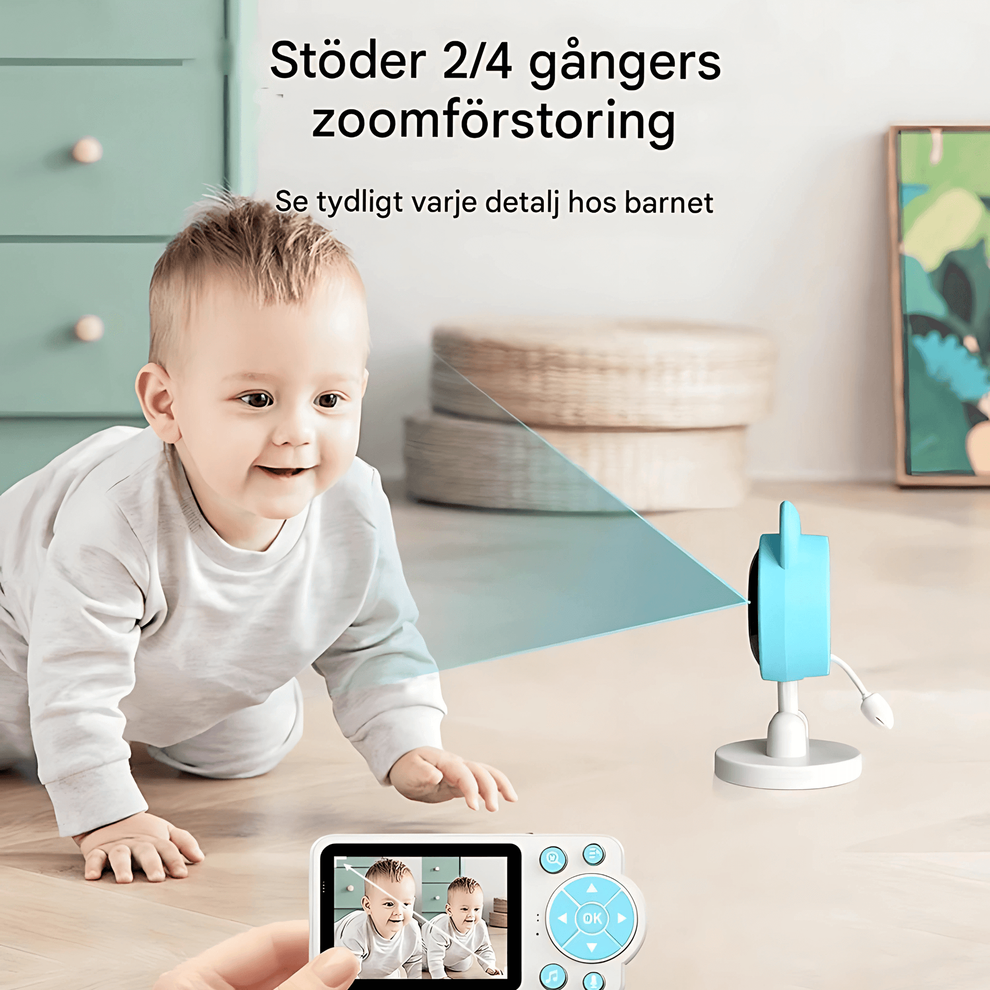 4. Justera kameravyn efter behov och aktivera funktioner som temperaturvarning, vaggvisor eller matningspåminnelser.