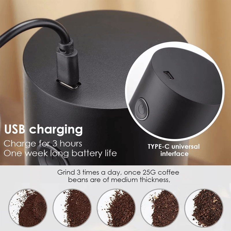 Upplev den perfekta malningen inom räckhåll med vår Typ C USB-laddningsbara elektriska kaffebönsmalare och höj din kaffeceremoni till nya höjder.