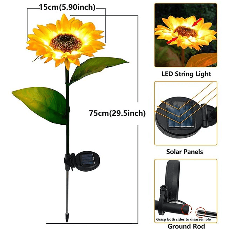 Vår solros trädgårdsdekoration är utformad för att tåla väder och vind och har en stor solros av mjukt tyg med ett IP65-vattentätt klassning. Stjälkar och blad stöds av hållbara järntrådar och erbjuder överlägsen flexibilitet.