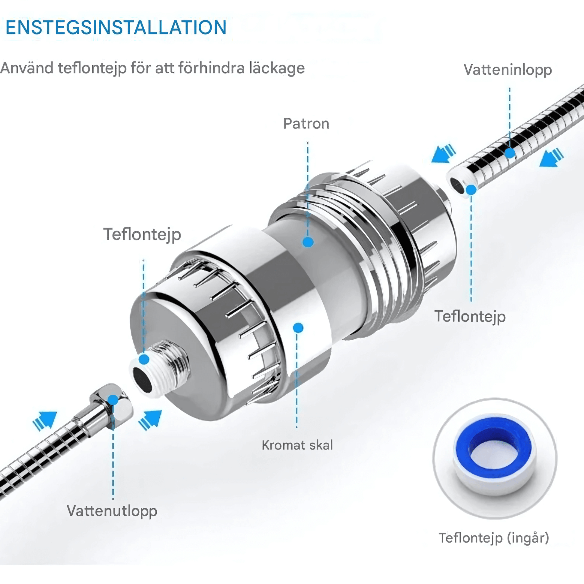 - 🌀 Upp till 20-stegsfiltrering – kan hjälpa till att reducera klor, tungmetaller och andra ämnen