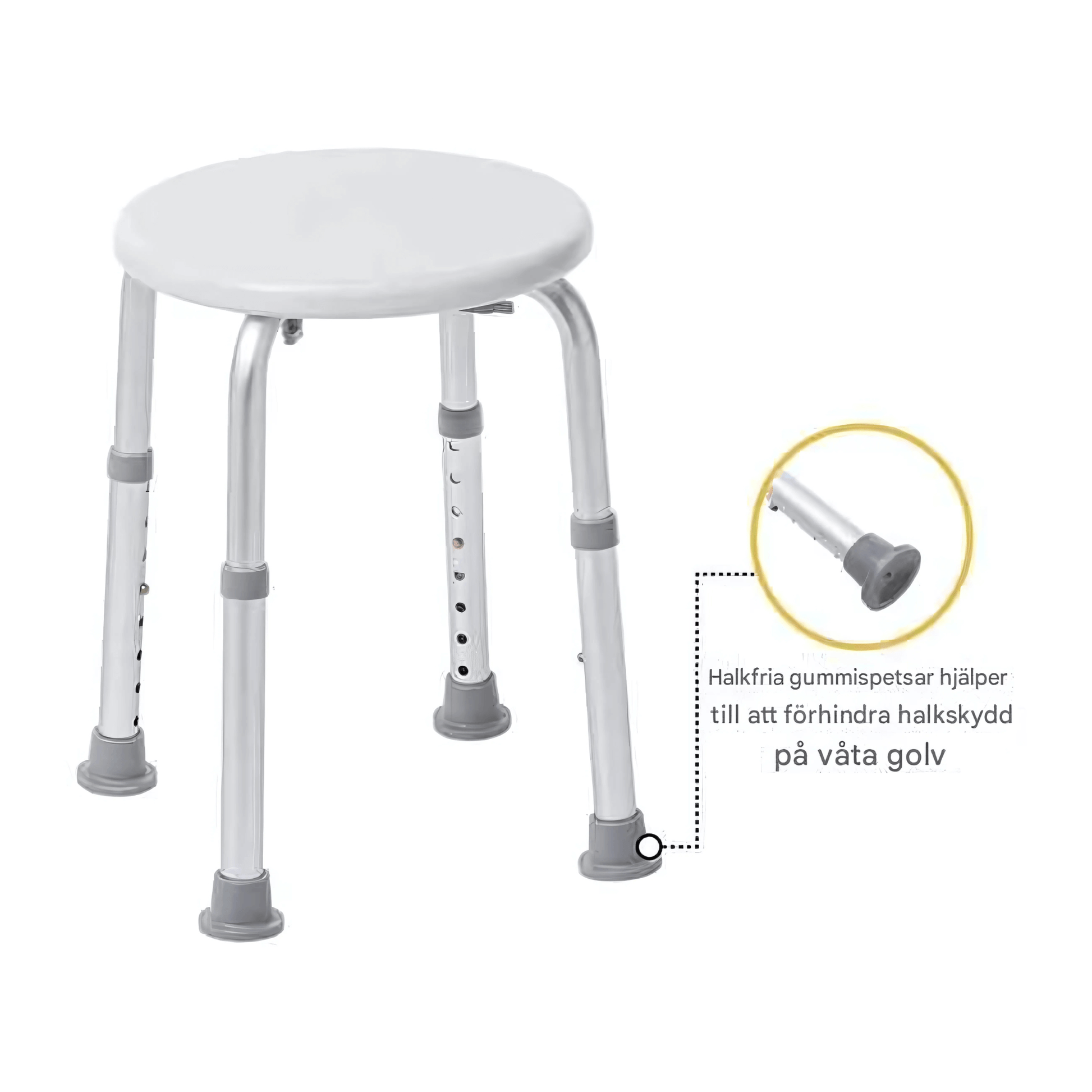 Med justerbara ben kan pallen anpassas i höjd mellan cirka 35 och 53 cm, vilket gör det möjligt att hitta en bekväm sittposition för olika användare och duschutrymmen.