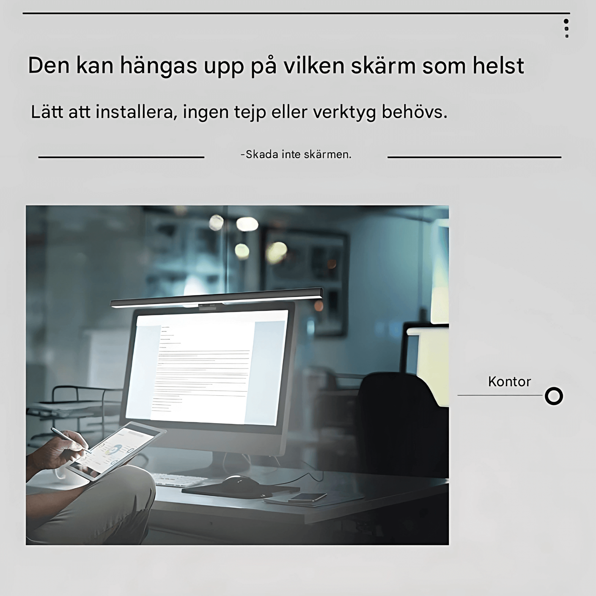 Lampan fästs direkt på skärmen utan att blockera vyn, vilket gör den idealisk för både små och stora skrivbord.